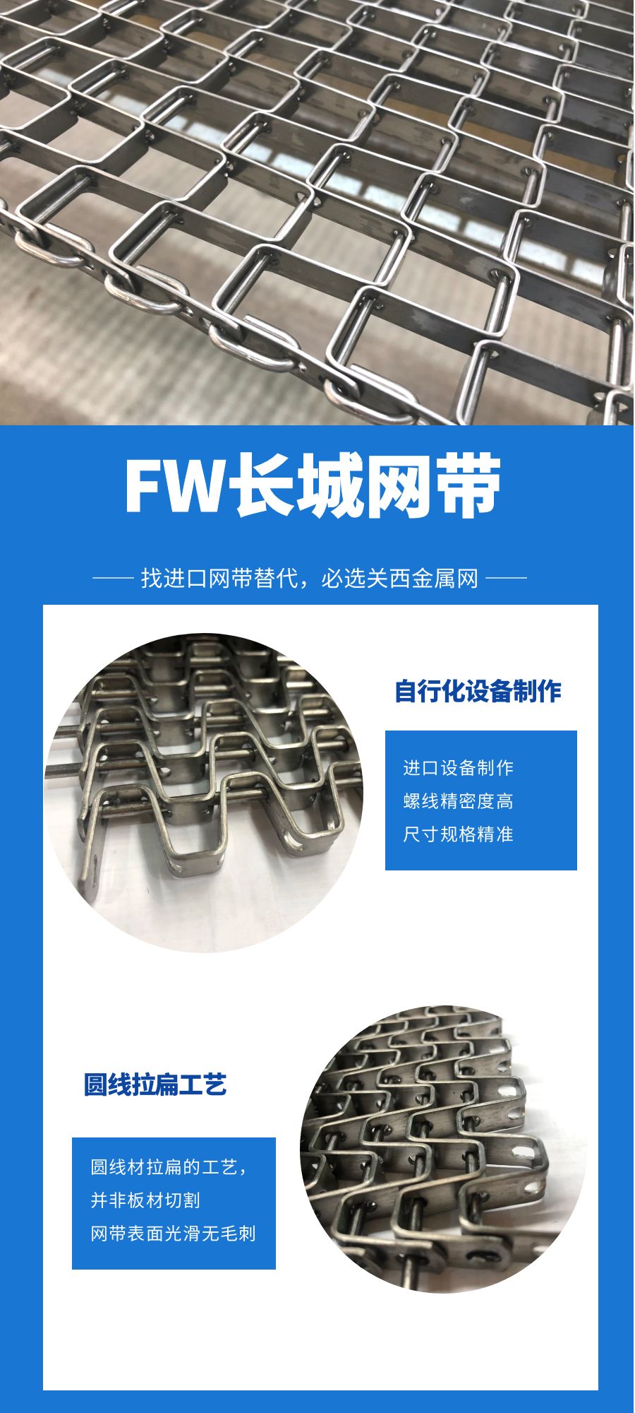 源自日本臺灣的先進網帶生產工藝,同時堅持自主研發,結合現代工業需求,具有等商子焊、網帶去油脂處理、扁線編織等多種特殊工藝。